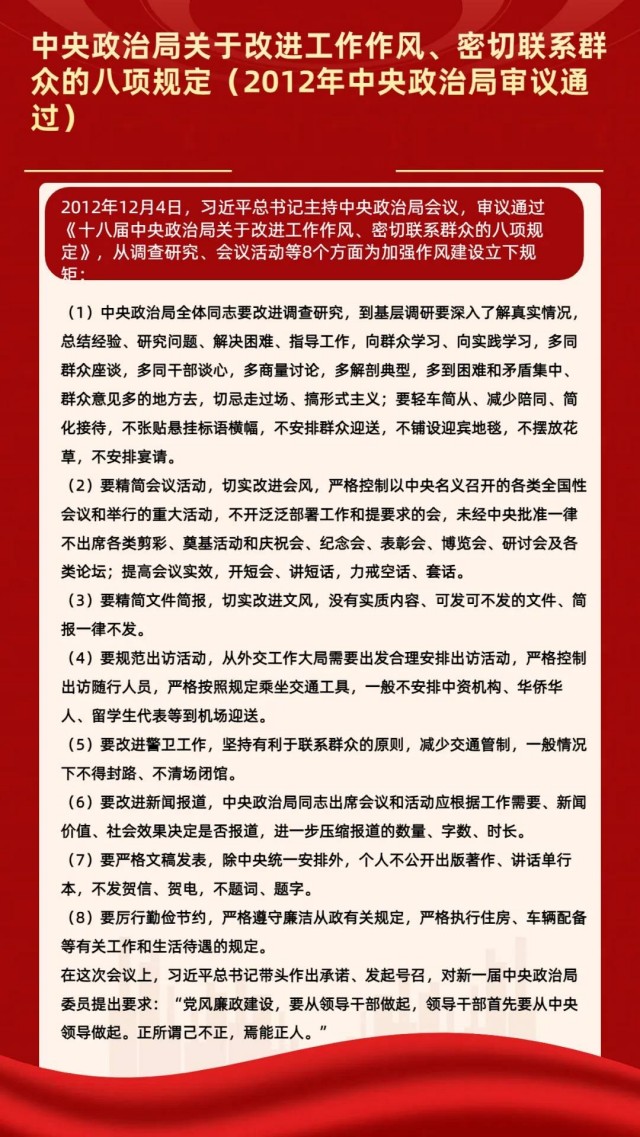 黨的作風就是黨的形象,關(guān)系人心向背,決定黨和國家事業(yè)成敗。黨的十八大以來,以習近平同志為核心的黨中央從制定和落實中央八項規(guī)定開局破題,堅持自上而下、以上率下,解決了新形勢下作風建設(shè)抓什么、怎么抓的問題。八項規(guī)定一子落地,作風建設(shè)滿盤皆活,黨風政風煥然一新,社風民風持續(xù)向好,我們黨以作風建設(shè)新氣象贏得了人民群眾信任擁護。